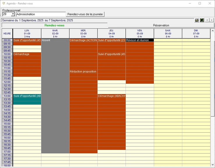 - Écran de visualisation hebdomadaire de l’agenda – Calendrier hebdomadaire.