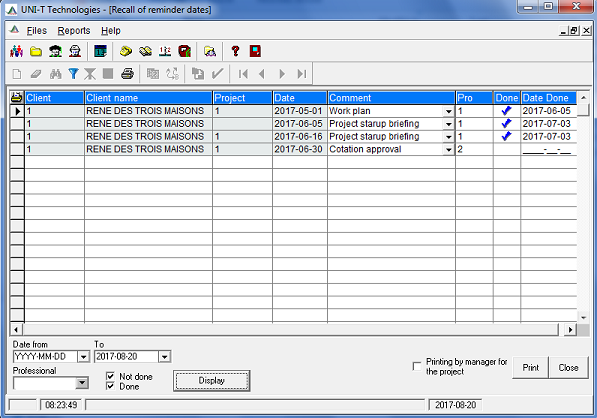 - Ability to apply search criteria: By date interval, Done and / or Not done, for a professional, for a client or a selection of clients.